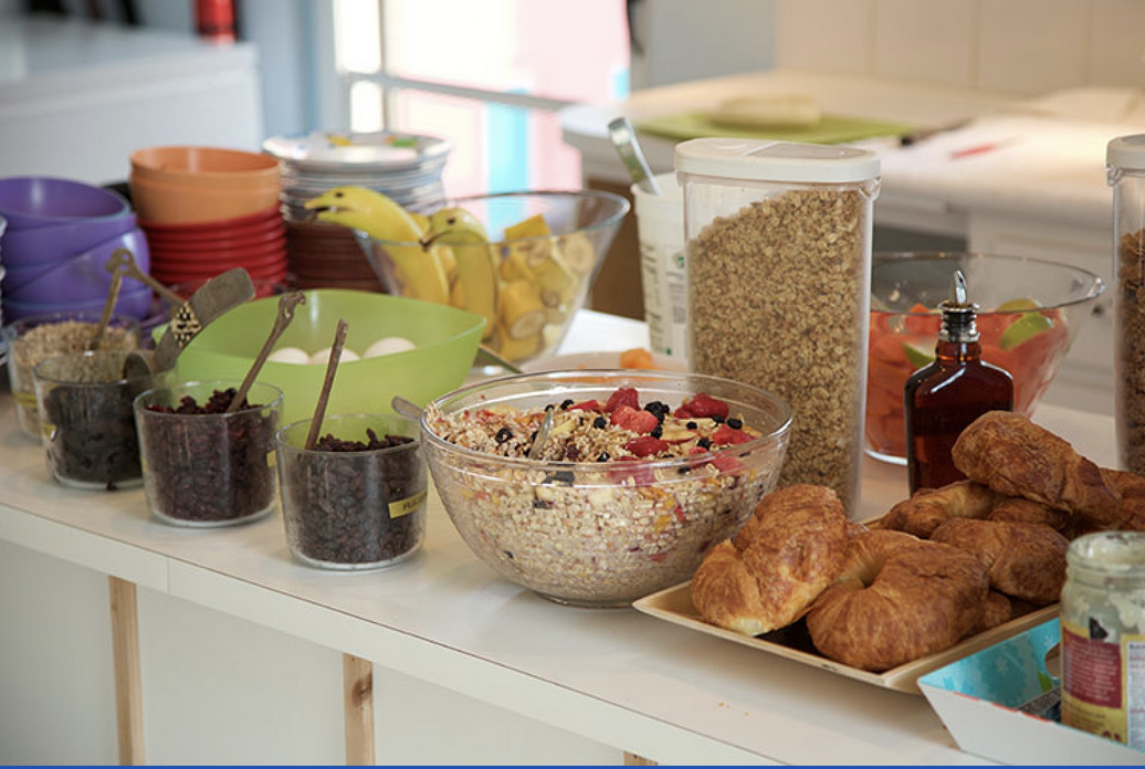 Usually includes your choice of eggs, granola, cereal, fruit, breads, orange juice, tea and coffee.