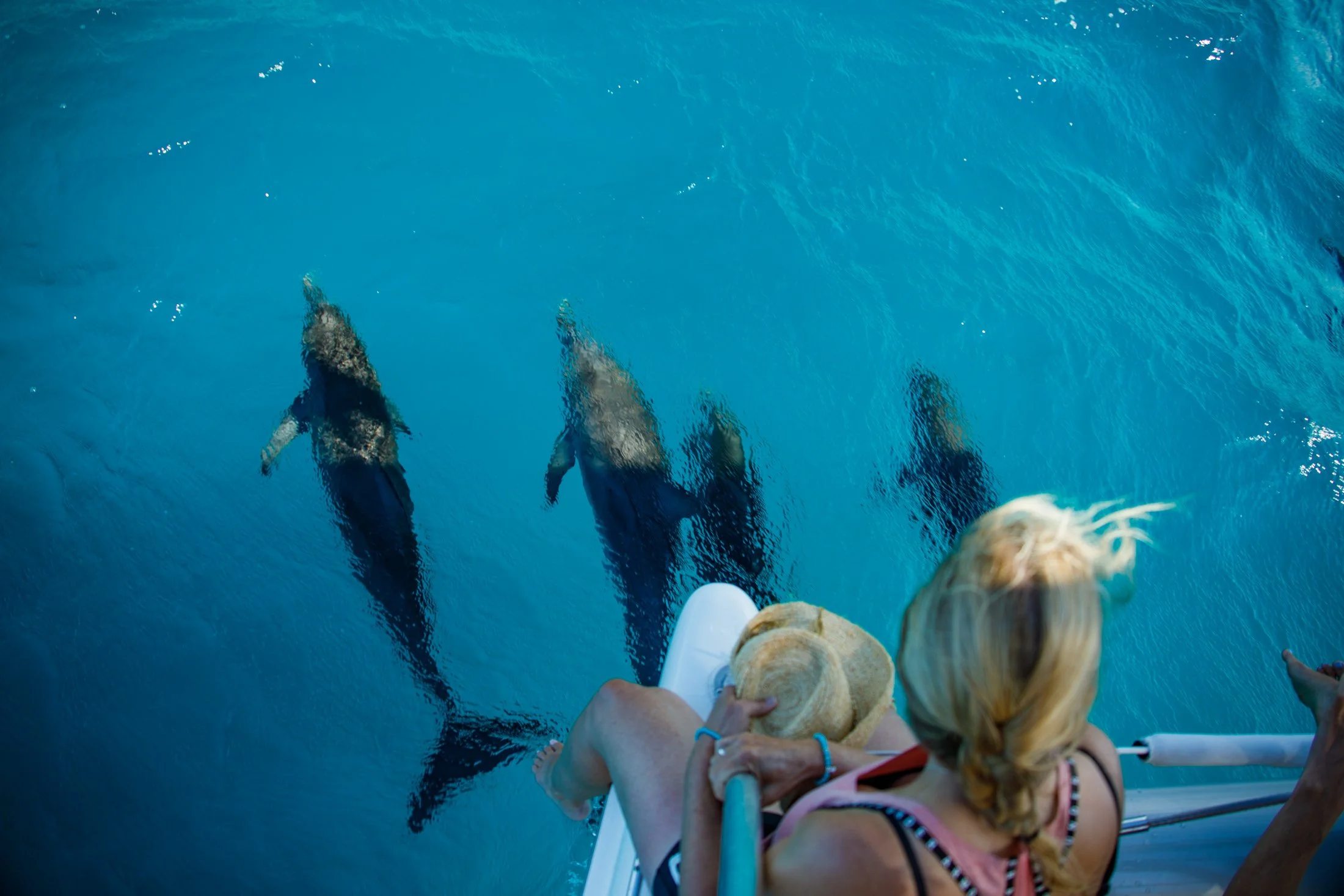 Pack your sundries into the provided day bag and find a spot on the boat to start our voyage. We’ll cruise out into the stunningly blue waters and look for dolphins.